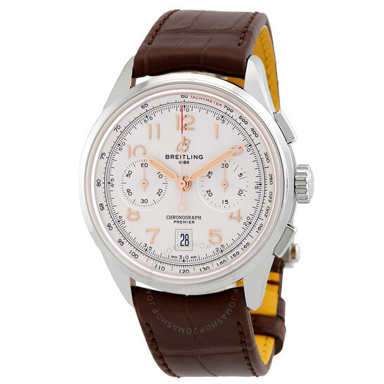 Silver-tone stainless steel case with a brown alligator leather strap. Fixed silver-tone ceramic bezel. Beige dial with rose gold-tone hands and index-Arabic numeral hour markers. Minute scale around the inner rim. Dial Type: Analog. Date display at the 6 o'clock position. Chronograph - two sub-dials displaying: 60 second and 30 minute. Breitling Calibre 01 Automatic movement, containing 47 Jewels, composed of 346 parts, bitting at 28800 vph, and has a power reserve of approximately 70 hours. Scratch resistant sapphire crystal. Pull / push crown. Transparent see through case back. Round case shape, case size: 42 mm, case thickness: 13.60 mm. Band width: 22 mm. Folding clasp. Water resistant at 100 meters / 330 feet. Functions: chronograph, date, hour, minute, second. Premier B01 Series. Luxury watch style. Watch label: Swiss Made. Breitling Premier B01 Chronograph Automatic Men's Watch AB0145211G1P2.