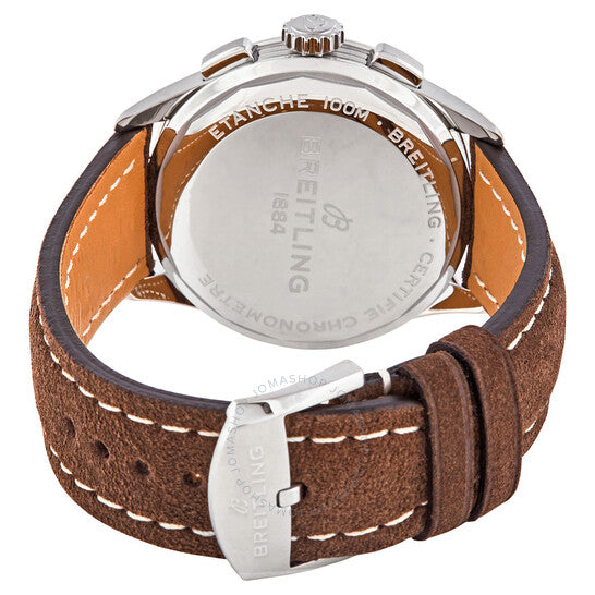 Stainless steel case with a brown (nubuck) leather strap. Fixed stainless steel bezel. Blue dial with luminous silver-tone hands and index hour markers. Minute markers. Tachymeter markings around the outer rim. Dial Type: Analog. Luminescent hands and markers. Date display at the 6 o'clock position. Chronograph - three sub-dials displaying: 60 seconds, 30 minutes, and 12 hours. Breitling calibre 13 automatic movement, based upon ETA Valjoux 7750, containing 25 Jewels, bitting at 28800 vph, and has a power reserve of approximately 42 hours. Scratch resistant sapphire crystal. Pull / push crown. Solid case back. Round case shape. Case size: 42 mm. Case thickness: 13.80 mm. Band width: 22 mm. Tang clasp. Water resistant at 100 meters / 330 feet. Functions: chronograph, date, hour, minute, second, chronometer. Luxury watch style. Watch label: Swiss Made. Breitling Premier Chronograph Automatic Chronometer Blue Dial Men's Watch A13315351C1X2.