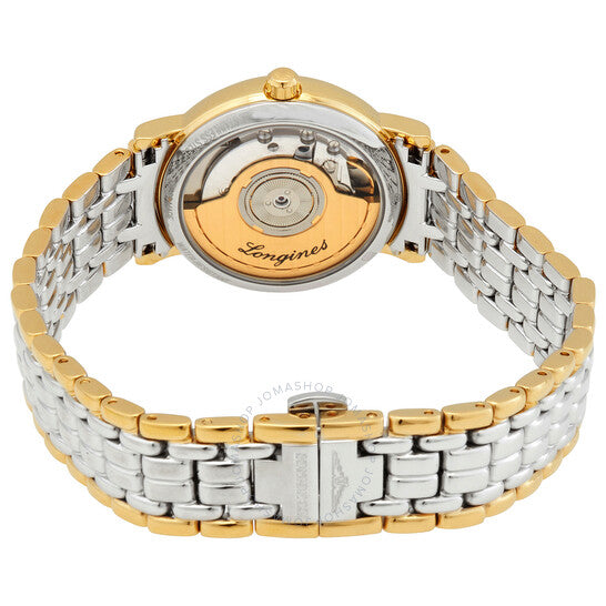 Stainless steel case with a two-tone (silver-tone and yellow gold PVD) stainless steel bracelet. Fixed yellow gold PVD bezel. Black dial with gold-tone hands and index hour markers. Minute markers around the outer rim. Dial Type: Analog. Date display at the o'clock position. Longines calibre L619 automatic movement, based upon ETA 2892-A2, containing 21 Jewels, bitting at 28800 vph, and has a power reserve of approximately 42 hours. Scratch resistant sapphire crystal. Pull / push crown. Transparent case back. Round case shape. Case size: 30 mm. Band width: 16 mm. Fold over clasp with a safety release. Water resistant at 30 meters / 100 feet. Functions: date, hour, minute, second. Presence Series. Dress watch style. Watch label: Swiss Made. Longines Presence Automatic Black Dial Ladies Watch L4.322.2.52.7.