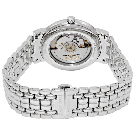 Stainless steel case with a stainless steel bracelet. Fixed stainless steel bezel. Blue dial with silver-tone sword-shaped hands and index hour markers. Minute markers around the outer rim. Dial Type: Analog. Date display at the 3 o'clock position. Longines calibre L888 automatic movement, based upon ETA A31.L11, containing 21 Jewels, bitting at 25200 vph, and has a power reserve of approximately 64 hours. Scratch resistant sapphire crystal. Pull / push crown. Transparent case back. Round case shape. Case size: 38.5 mm. Band width: 20 mm. Hidden fold over clasp. Water resistant at 30 meters / 100 feet. Functions: date, hour, minute, second. Presence Series. Dress watch style. Watch label: Swiss Made. Longines Presence Automatic Blue Dial Men's Watch L4.921.4.92.6.
