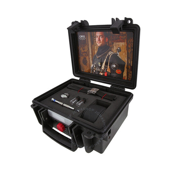 Titanium case with a titanium bracelet. Black (orange detail) dial with silver-tone hands and index hour markers. Minute markers around the outer rim. Dial Type: Analog. Luminescent hands and markers. Date display at the 5 o'clock position. Automatic movement. Scratch resistant sapphire crystal. Screw down crown. Solid case back. Case diameter: 49 mm. Round case shape. Fold over with safety clasp. Water resistant at 1000 meters / 3281 ft.. Functions: date, hour, minute, second, moonphase indicator. Additional Info: waterproof presentation box set, additional rubber strap, professional strap changing tools. Casual watch style. Watch label: Swiss Made. Oris ProDiver Pointer Moon Black Dial Titanium Men's Watch 01 761 7682 7134-Set.