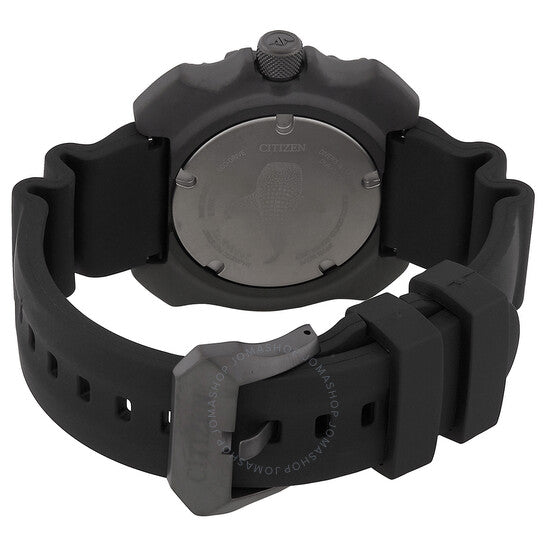 Grey super titanium case with a black polyurethane strap. Uni-directional rotating grey super titanium bezel with a blue insert. Blue dial with silver-tone hands and Arabic numeral hour markers. Minute markers around the outer rim. Dial Type: Analog. Luminescent hands and markers. Date display at the 3 o'clock position. Citizen Caliber Eco-Drive E168 eco-drive movement. Scratch resistant mineral crystal. Screw down crown. Solid case back. Round case shape, case size: 47 mm. Buckle clasp. Water resistant at 200 meters / 660 feet. Functions: date, hour, minute, second, solar-powered. Promaster Dive Series. Dive watch style. Watch label: Japan Movt. Citizen Promaster Dive Eco-Drive Blue Dial Men's Watch BN0225-04L.