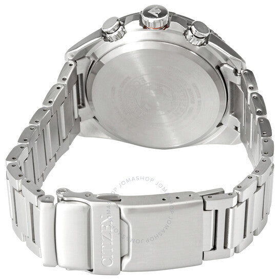 Stainless steel case with a stainless steel bracelet. Fixed black-plated bezel showing tachymeter markings. Blue dial with luminous black hands and index hour markers. Minute markers. World time cities around the outer rim. Dial Type: Analog. Luminescent hands and markers. Date display at the 4 o'clock position. Day of the week display. Three blacksub-dials displaying: 24 hours, 12 hour (alarm) and function. Citizen caliber E660 eco-drive movement with a 300-day power reserve. Scratch resistant sapphire crystal. Solid case back. Round case shape. Case size: 44.5 mm. Case thickness: 12.6 mm. Band width: 24 mm. Deployment clasp. Water resistant at 200 meters / 660 feet. Functions: chronograph, date, day, hour, minute, second, time for 24 cities, radio controlled. Promaster Series. Casual watch style. Watch label: Japan Movt. Citizen Promaster Eco-Drive Chronograph Blue Dial Men's Watch CB5034-82L.