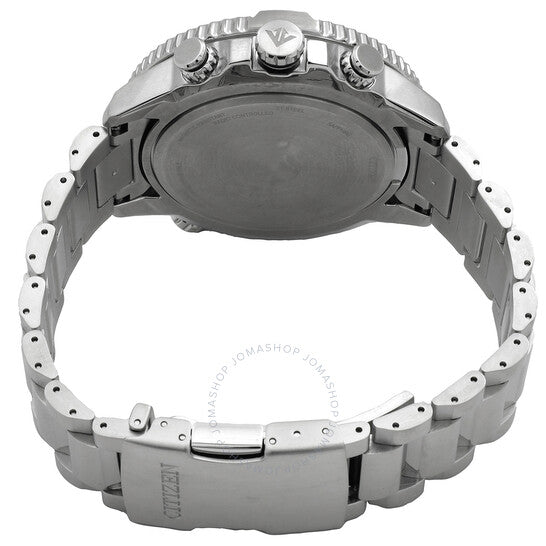 Silver-tone stainless steel case and bracelet. Uni-directional rotating silver-tone stainless steel bezel. Blue dial with silver-tone hands and index-Arabic numeral hour markers. Arabic numeral marker appears at the 6 and 12 o'clock positions. Minute markers around the outer rim. Dial Type: Analog. Luminescent hands and markers. Date display at the 4 o'clock position. Three sub-dials displaying: 24 hour, day and 60 second. Citizen Caliber Eco-Drive H804 eco-drive movement. Scratch resistant sapphire crystal. Solid case back. Round case shape, case size: 48 mm, case thickness: 13 mm. Band width: 22 mm. Fold over clasp with a safety release. Water resistant at 200 meters / 660 feet. Functions: perpetual calendar, atomic timekeeping, radio controlled, chronograph, world time, date, day, hour, minute, second, power reserve indicator, solar-powered. Promaster Navihawk A-t Series. Sport watch style. Watch label: Japan Movt. Citizen Promaster Navihawk A-T Chronograph Blue Dial Men's Watch AT8220-55L.