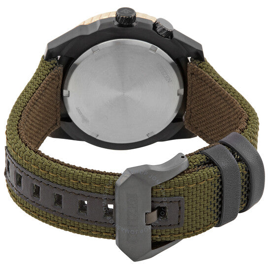 Black IP stainless steel case with a green nylon strap. Rose gold-tone stainless steel bezel. Black dial with silver-tone hands and index-Arabic numeral hour markers. Minute markers around the outer rim. Dial Type: Analog. Luminescent hands and markers. Date display at the 3 o'clock position. Citizen Caliber Eco-Drive B877 eco-drive movement. Scratch resistant mineral crystal. Screw down crown. Solid case back. Round case shape, case size: 42.5 mm, case thickness: 12.5 mm. Tang clasp. Water resistant at 200 meters / 660 feet. Functions: date, GMT, second time zone, hour, minute, second, solar-powered. Promaster Sky Series. Sport watch style. Watch label: Japan Movt. Citizen Promaster Sky GMT Eco-Drive Black Dial Men's Watch BJ7136-00E.