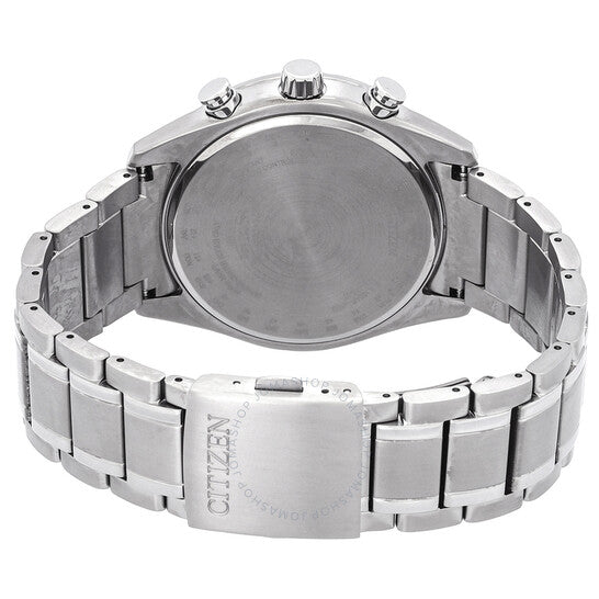 Silver-tone titanium case with a silver-tone titanium/metal bracelet. Fixed silver-tone titanium bezel. Green dial with silver-tone hands and index hour markers. Dial Type: Analog. Luminescent hands and markers. Date display at the 4 o'clock position. Chronograph - sub-dials displaying: three-moonphase,am/pm,day of the week. Citizen Caliber H874 quartz movement. Scratch resistant sapphire crystal. Screw down crown. Solid case back. Round case shape, case size: 43 mm, case thickness: 10.9 mm. Fold over with double safety release clasp. Water resistant at 100 meters / 330 feet. Functions: chronograph, date, hour, minute, second,worldtimer 26 zones,perpetual calendar,moonphase,GMT. Radiocontrolado Series. Sport watch style. Watch label: Japan Movt. Citizen Radiocontrolado Perpetual Chronograph Quartz Green Dial Men's Watch BY1010-81X.