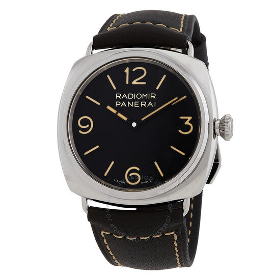 Silver-tone stainless steel case with a black leather strap. Fixed silver-tone stainless steel bezel. Black dial with black hands and index-Arabic numeral hour markers. Arabic numerals appear at the 3, 6, 9 and 12 o'clock positions. Dial Type: Analog. Luminescent hands and markers. Panerai Calibre P.6000 Hand Wind movement, containing 19 Jewels, bitting at 21600 vph, and has a power reserve of approximately 72 hours. Scratch resistant sapphire crystal. Solid case back. Cushion case shape, case size: 45 mm. Water resistant at 100 meters / 330 feet. Functions: hour, minute. Radiomir Officine Series. Luxury watch style. Watch label: Swiss Made. Panerai Radiomir Officine Hand Wind Black Dial Men's Watch PAM01382.
