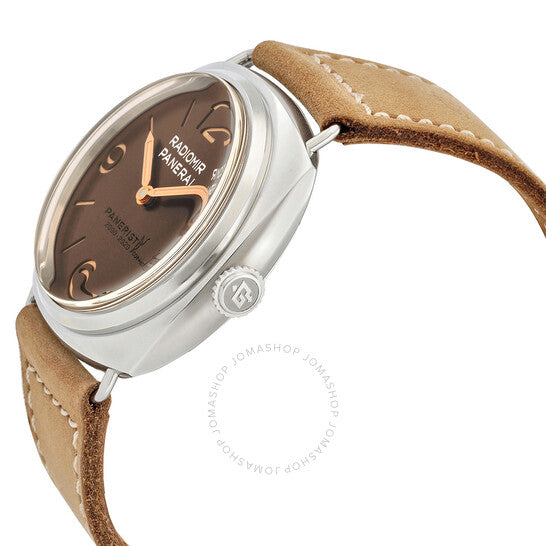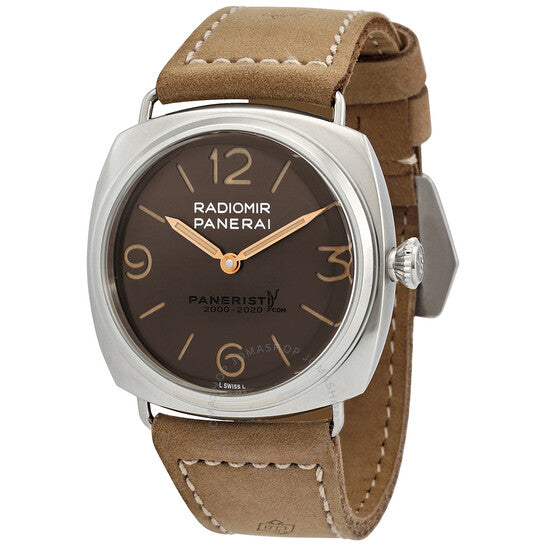 Stainless steel case with a brown leather strap. Fixed stainless steel bezel. Brown dial with index-Arabic numeral hour markers. Dial Type: Analog. One subdial displaying: small second. Panerai Calibre P.6000 Hand Wind movement, containing 19 Jewels, bitting at 21600 vph, and has a power reserve of approximately 72 hours. Scratch resistant sapphire crystal. Screw down crown. Solid case back. Round case shape, case size: 45. Water resistant at 100 meters / 330 feet. Functions: hour, minute, small second. Radiomir Series. Luxury watch style. Watch label: Swiss Made. Panerai Radiomir Venti Hand Wind Brown Dial Men's Watch PAM02020.