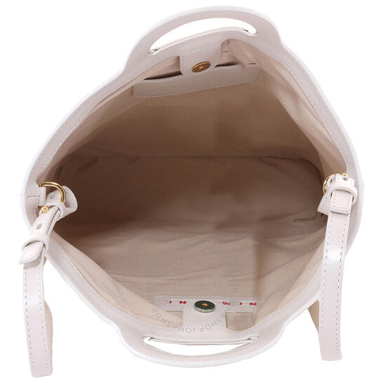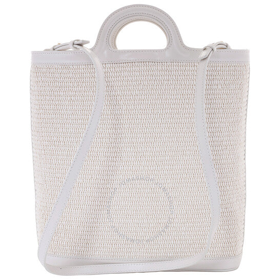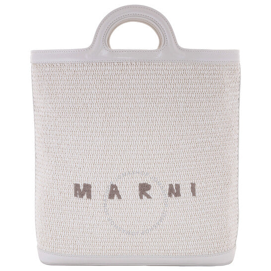Marni Ladies Tote. SKU: SBMP0179Q0-SHELL. Color: Shell. Size: 28 x 30 x 7 cm. Marni Raffia Tropicalia Tote Bag. The Tropicalia Bag features a combination of leather and raffia-effect fabric, embossed handle details, a detachable leather shoulder strap, a sturdy leather bottom, and gold-colored metal accents, with an embroidered logo on the front and a spacious main compartment. 52% Cotton, 48% Polyamide; Details: 100% Leather. Made in Italy.