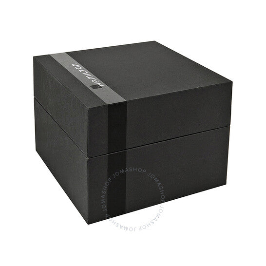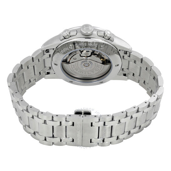 Silver-tone stainless steel case with a silver-tone stainless steel bracelet. Fixed silver-tone stainless steel bezel. Black dial with silver-tone alpha-style hands and index hour markers. Tachymeter markings. Minute markers. Arabic numeral minute markers (at 5 minute intervals) around the outer rim. Dial Type: Analog. Date display at the 4 o'clock position. Chronograph - three sub-dials displaying: 60 second, 30 minute and 12 hour. Hamilton calibre H-21 automatic movement, based upon ETA 7750, containing 25 Jewels, bitting at 28800 vph, and has a power reserve of approximately 60 hours. Scratch resistant sapphire crystal. Pull / push crown. Skeleton case back. Round case shape. Case size: 44 mm. Case thickness: 15.3 mm. Band width: 22 mm. Fold over clasp. Water resistant at 50 meters / 165 feet. Functions: chronograph, date, hour, minute, second, tachymeter. Railroad Series. Casual watch style. Watch label: Swiss Made. Hamilton Railroad Automatic Black Dial Men's Watch H40656131.