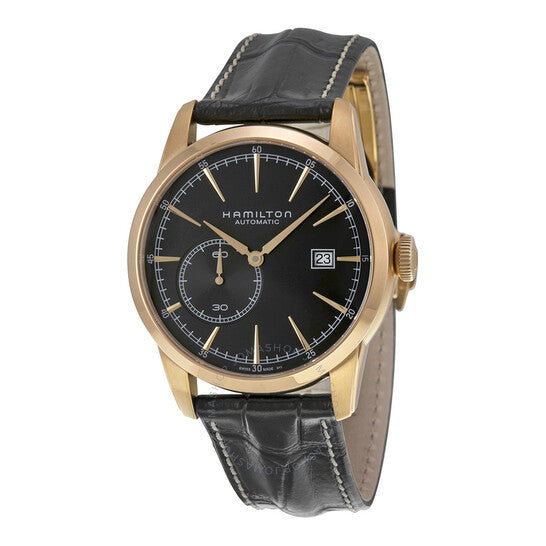 Rose gold-plated stainless steel case with a black leather strap. Fixed rose gold-plated bezel. Black dial with rose gold-tone hands and index hour markers. Minute markers around the outer rim. Dial Type: Analog. Date display at the 3 o'clock position. Small seconds sub-dial at the 8 o'clock position. Automatic movement with a 42-hour power reserve. Scratch resistant sapphire crystal. Skeleton case back. Case diameter: 42 mm. Case thickness: 13.25 mm. Round case shape. Band width: 22 mm. Deployment clasp. Water resistant at 50 meters / 165 feet. Functions: date, hour, minute, second. Dress watch style. Watch label: Swiss Made. Hamilton Railroad Small Seconds Black Dial Black Leather Men's Watch H40545731.