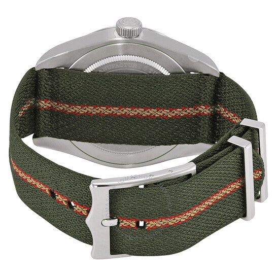 Silver-tone stainless steel case with a green with red and beige stripes fabric strap. Fixed satin finish stainless steel bezel. Black dial with index-Arabic numerals hour markers. Dial Type: Analog. Tudor Calibre MT5402 (COSC) automatic movement with a 70-hour power reserve. Scratch resistant sapphire crystal. Screw down crown. Round case shape, case size: 39 mm. Buckle clasp. Water resistant at 100 meters / 330 feet. Functions: hour, minute, second. Ranger Series. Dress watch style. Watch label: Swiss Made. Tudor Ranger Automatic Black Dial Men's Fabric Watch M79950-0003.