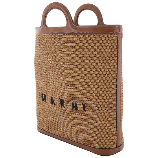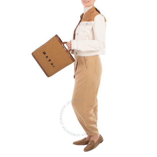 Marni Ladies Tote. SKU: SBMP0179Q0-RAW SIENNA. Color: Raw Sienna. Size: 28 x 30 x 7 cm. Marni Raw Sienna Raffia Tote Bag. The Tropicalia Bag features a combination of leather and raffia-effect fabric, embossed handle details, a detachable leather shoulder strap, a sturdy leather bottom, and gold-colored metal accents, with an embroidered logo on the front and a spacious main compartment. 52% Cotton, 48% Polyamide; Details: 100% Leather. Made in Italy.