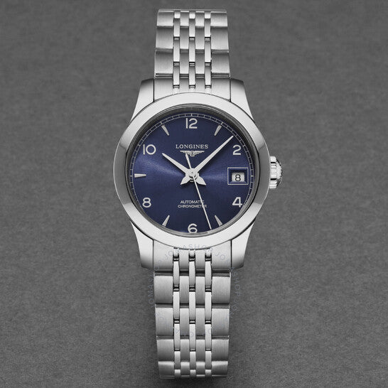 Silver-tone stainless steel case and bracelet. Fixed silver-tone bezel. Blue dial with silver-tone hands and Arabic numeral, index hour markers. Dial Type: Analog. Date display at the 3 o'clock position. Longines Calibre L592.4 Automatic movement, based upon ETA A20.L11, containing 22 Jewels, bitting at 28800 vph, and has a power reserve of approximately 40 hours. Scratch resistant sapphire crystal. Transparent see through case back. Round case shape, case size: 26 mm. Deployment clasp. Water resistant at 30 meters / 100 feet. Functions: date, hour, minute, second. Record Series. Watch label: Swiss Made. Longines Record Automatic Blue Dial Ladies Watch L23204966.