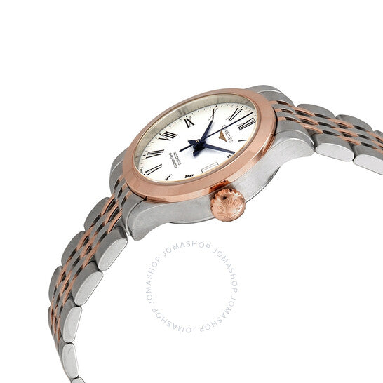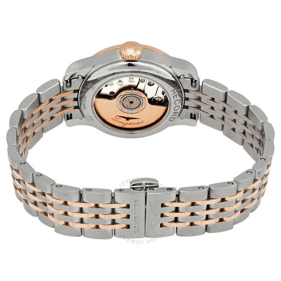 Stainless steel case with a stainless steel with 18kt rose gold-cap 200 bracelet. Fixed 18kt rose gold-cap 200 bezel. White dial with blue hands and Roman numeral hour markers. Minute markers around the outer rim. Dial Type: Analog. Date display at the 3 o'clock position. Longines calibre L592.4 automatic movement, based upon ETA A20.L11, containing 22 Jewels, bitting at 28800 vph, and has a power reserve of approximately 40 hours. Scratch resistant sapphire crystal. Pull / push crown. Transparent case back. Round case shape. Case size: 26 mm. Case thickness: 10/3 mm. Band width: 13 mm. Fold over with push button release clasp. Water resistant at 30 meters / 100 feet. Functions: date, hour, minute, second. Record Series. Dress watch style. Watch label: Swiss Made. Longines Record Automatic White Dial Ladies Watch L2.320.5.11.7.