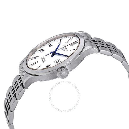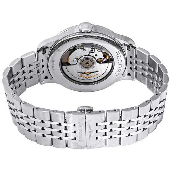 Stainless steel case with a stainless steel bracelet. Fixed stainless steel bezel. White dial with blue hands and Roman numeral hour markers. Minute markers around the outer rim. Dial Type: Analog. Date display at the 3 o'clock position. Longines calibre L888.4 automatic movement, based upon ETA A31.L11, containing 21 Jewels, bitting at 25200 vph, and has a power reserve of approximately 64 hours. Scratch resistant sapphire crystal. Pull / push crown. Transparent case back. Round case shape. Case size: 38.5 mm. Case thickness: 10 mm. Band width: 19 mm. Fold over clasp with a safety release. Water resistant at 30 meters / 100 feet. Functions: date, hour, minute, second. Record Series. Casual watch style. Watch label: Swiss Made. Longines Record Automatic White Dial Men's Watch L28204116.