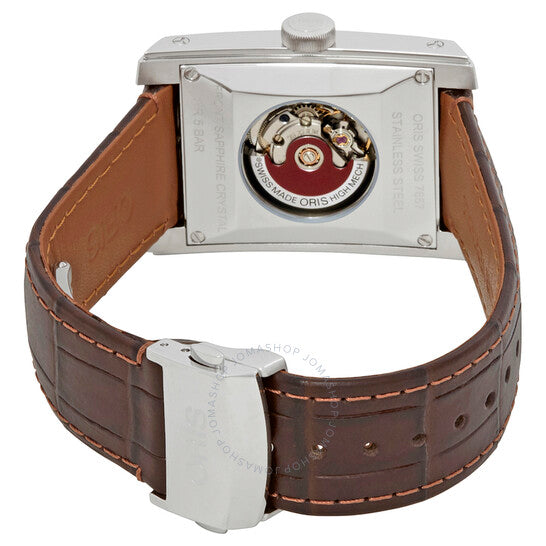 Silver-tone stainless steel case with a brown leather strap. Fixed silver-tone stainless steel bezel. Silver dial with luminous blue hands and Roman numeral hour markers. Dial Type: Analog. Luminescent hands. Date display above the 6 o'clock position. Oris Calibre 561, base ETA 2671 Automatic movement, based upon ETA 2671, containing 25 Jewels, bitting at 28800 vph, and has a power reserve of approximately 38 hours. Scratch resistant sapphire crystal. Pull / push crown. Transparent case back. Rectangle case shape, case size: 30 mm x 44 mm, case thickness: 10.7 mm. Band width: 22 mm, band length: 8 inches. Deployment clasp. Water resistant at 50 meters / 165 feet. Functions: date, hour, minute, second. Rectangular Date Series. Casual watch style. Watch label: Swiss Made. Oris Rectangular Date Automatic Silver Dial Men's Watch 01 561 7657 4071-07 5 21 70FC.