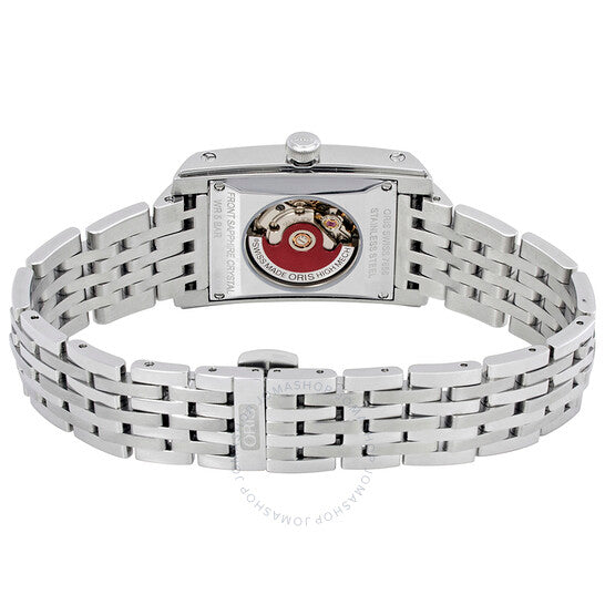 Stainless steel case with a stainless steel bracelet. Fixed stainless steel bezel. Black dial with luminous hands and Arabic numeral hour markers. Dial Type: Analog. Luminescent hands. Date display at the 6 o'clock position. Oris calibre 561, base ETA 2671 automatic movement with a 38-hour power reserve. Scratch resistant sapphire crystal. Pull / push crown. Transparent case back. Rectangle case shape. Case dimensions: 38 mm x 24.50 mm. Case thickness: 10 mm. Band width: 17 mm. Band length: 7 inches. Deployment clasp. Water resistant at 50 meters / 165 feet. Functions: date, hour, minute, second. Luxury watch style. Watch label: Swiss Made. Oris Rectangular Date Black Dial Ladies Watch 561-7656-4071MB.