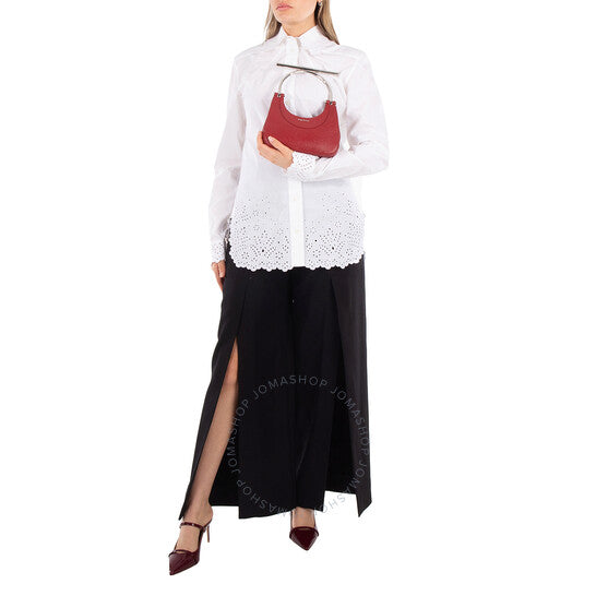 Alexander McQueen Ladies Crossbody. SKU: 803525 1VDBB 6820. Barcode: 3666582720643. Color: Red/Silver. Size: Length 20 x Height 17.5 x Depth 6 cm / 7.8 x 6.8 x 2.3 inches. Alexander McQueen Red/Silver Ladies Mini T-bar Bag. The McQueen Mini T-Bar Bag, crafted from red lamb leather, features a structured body with pleated sides for a sophisticated look. It is detailed with a bold circular T-Bar handle in silver-tone metal, engraved with the McQueen logo. This versatile bag can be carried handheld or worn crossbody using the detachable silver-tone metal chain strap, with a strap drop of 55 cm (21 inches). The bag is secured with a magnet fastening and includes McQueen metal lettering and silver-finished hardware. Inside, you'll find one central compartment, an internal card slot with a metal D-ring, and a luxurious Nappa leather lining. Material: Lambskin. Made in Italy.