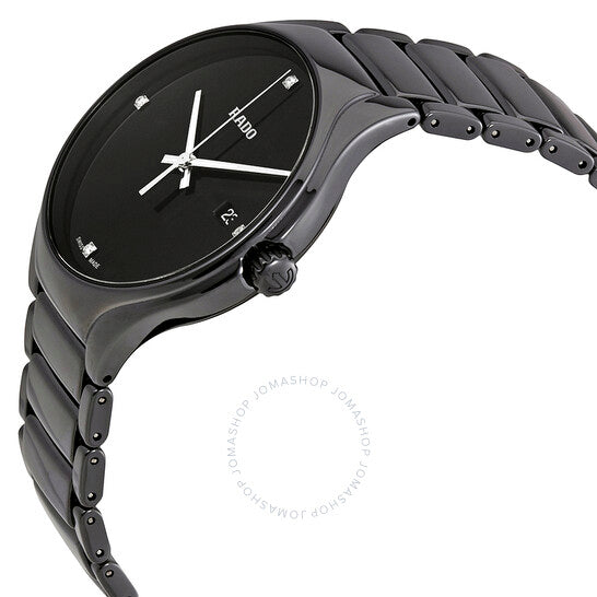 High-tech black ceramic case and bracelet. Fixed black ceramic bezel. Black dial with rhodium with luminous fill hands. Diamond markers set at the 3, 6, 9 and 12 o'clock positions. The Rado name appears below the 12 o'clock position. Dial Type: Analog. Luminescent hands. Date display at the 3 o'clock position. Quartz movement. Scratch resistant sapphire crystal. Solid case back. Case size: 40 mm. Round case shape. Deployment clasp with a push button release. Water resistant at 50 meters / 165 feet. Functions: date, hour, minute, second. Dress watch style. Watch label: Swiss Made. RadoTrue Black Dial Quartz Men's Watch R27238722.