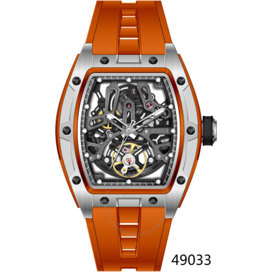 Silver-tone and silver stainless steel case with a orange silicone strap. Fixed silver-tone stainless steel bezel. Black dial with silver-tone hands and index hour markers. Minute markers around the outer rim. Dial Type: Analog. Luminescent hands and markers. Caliber JX-2807 automatic movement. Scratch resistant Flame Fusion crystal. Screw down crown. Transparent see through case back. Tonneau case shape, case size: 44 mm, case thickness: 14.7 mm. Band width: 26 mm, band length: 9.75 inches. Buckle clasp. Water resistant at 30 meters / 100 feet. Functions: hour, minute, second. S1 Rally Series. Casual watch style. Invicta S1 Rally Automatic Black Dial Men's Watch 49033.