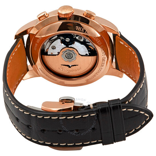 18kt rose gold case with a black (alligator) leather strap. Fixed 18kt rose gold bezel. Silver dial with luminous rose gold-tone hands and index hour markers. An Arabic numeral appears at the 12 o'clock position. Minute markers around the outer rim. Dial Type: Analog. Luminescent hands and markers. Date display between the 4 and 5 o'clock positions. Chronograph - three sub-dials displaying: 60 second, 30 minute and 12 hour. Longines calibre L688 automatic movement, based upon ETA A08.L01, containing 27 Jewels, bitting at 28800 vph, and has a power reserve of approximately 54 hours. Scratch resistant sapphire crystal. Pull / push crown. Transparent case back. Round case shape. Case size: 41 mm. Case thickness: 14 mm. Band width: 20 mm. Deployant clasp. Water resistant at 30 meters / 100 feet. Functions: chronograph, column wheel, date, hour, minute, small second. Saint-imier Series. Luxury watch style. Watch label: Swiss Made. Longines Saint-Imier Automatic Chronograph Silver Dial Men's Watch L2.752.8.72.3.