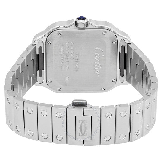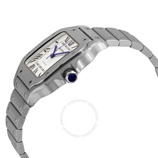 Stainless steel case with a stainless steel bracelet. Fixed stainless steel bezel. Silvered opaline dial with blued-steel sword-shaped hands and black Roman numeral hour markers. Minute markers around an inner ring. Dial Type: Analog. Cartier calibre 1847 MC automatic movement, containing 23 Jewels, bitting at 28800 vph, and has a power reserve of approximately 42 hours. Scratch resistant sapphire crystal. Blue cabochoon crown. Solid case back. Square case shape. Case dimensions: 35.1 mm x 41.9 mm. Case thickness: 8.83 mm. Band width: 16 mm. Deployment clasp. Water resistant at 100 meters / 330 feet. Functions: hour, minute, second. Additional Info: interchangeable calfskin leather strap. Santos Series. Luxury watch style. Watch label: Swiss Made. Cartier Santos Silvered Opaline Dial Men's Watch WSSA0029.