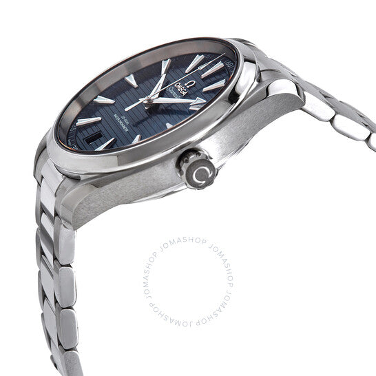 Silver-tone stainless steel case and bracelet. Fixed silver-tone stainless steel bezel. Blue horizontal "teak" pattern dial with luminous silver-tone hands and index hour markers. Minute markers around the outer rim. Dial Type: Analog. Luminescent hands and markers. Date display at the 6 o'clock position. Omega Calibre 8900 Automatic movement, based upon Omega 8500, containing 39 Jewels, bitting at 25200 vph, and has a power reserve of approximately 60 hours. Scratch resistant sapphire crystal. Screw down crown. Transparent case back. Round case shape, case size: 41 mm. Band width: 20 mm. Fold over clasp with a push button release. Water resistant at 150 meters / 500 feet. Functions: date, hour, minute, second, co-axial escapement, chronometer. Seamaster Aqua Terra Series. Luxury watch style. Watch label: Swiss Made. Omega Seamaster Aqua Terra Automatic Chronometer Men's Watch 220.10.41.21.03.004.