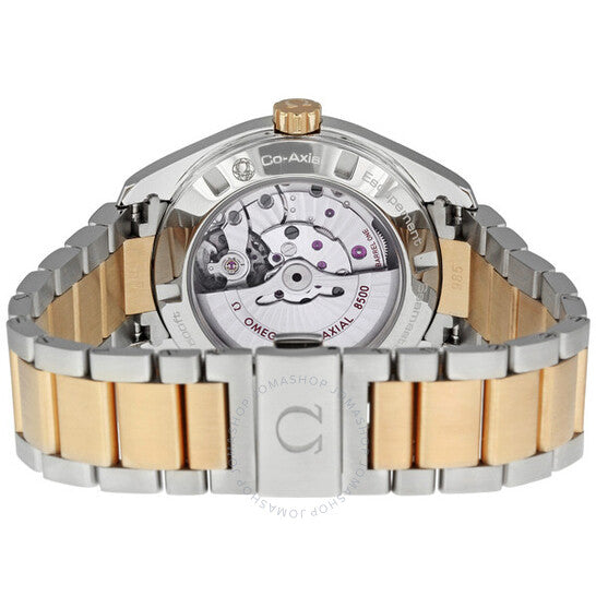 Stainless steel case with a two-tone stainless steel and 18 kt rose gold bracelet. Fixed 18kt rose gold bezel. Grey dial with gold-tone hands and index hour markers. Minute markers around the outer rim. Date display appears at the 3 o'clock position. Automatic movement. Scratch resistant sapphire crystal. Screw down crown. Skeleton case back. Case diameter: 44.5 mm. Case thickness: 13.2 mm. Push button fold over clasp. Water resistant at 150 meters/ 500 feet. Functions: hours, minutes, seconds, calendar. Omega Seamaster Aqua Terra Automatic Men's Watch 23120422106001.