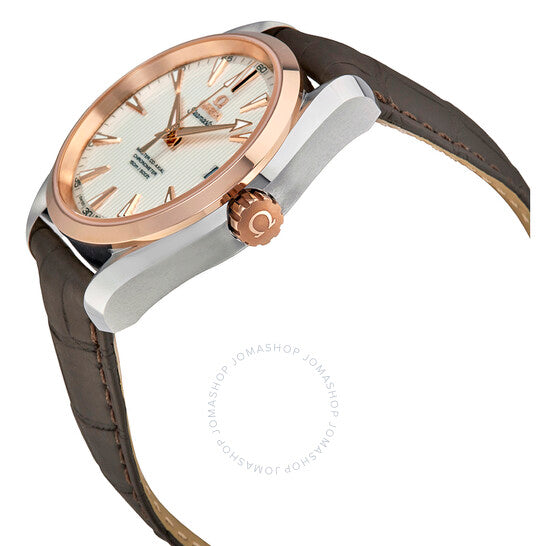 Silver-tone stainless steel case with a brown crocodile leather strap. Fixed 18kt rose gold bezel. Silver dial with luminous rose gold-tone hands and index hour markers. Minute markers around the outer rim. Dial Type: Analog. Luminescent hands and markers. Date display at the 3 o'clock position. Omega Calibre 8500 automatic movement with a 60-hour power reserve. Scratch resistant sapphire crystal. Screw down crown. Transparent case back. Round case shape, case size: 38.5 mm, case thickness: 13.2 mm. Fold over with push button release clasp. Water resistant at 150 meters / 500 feet. Functions: date, hour, minute, second, chronometer. Luxury watch style. Watch label: Swiss Made. Omega Seamaster Aqua Terra Chronometer Silver Dial Men's Watch 23123392102001.