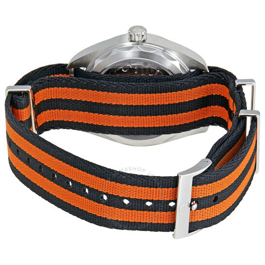 Stainless steel case with a black and orange NATO nylon strap. Fixed stainless steel bezel. Silver dial with luminous black arrow-shaped hands and index hour markers. Arabic numeral minute markers (at 5 minute intervals). Minute markers around the outer rim. Dial Type: Analog. Date display at the 6 o'clock position. Omega calibre 8900 automatic movement, based upon Omega 8500, containing 39 Jewels, bitting at 25200 vph, and has a power reserve of approximately 60 hours. Scratch resistant sapphire crystal. Pull / push crown. Transparent case back. Round case shape. Case size: 41 mm. Band width: 20 mm. Tang clasp. Water resistant at 150 meters / 500 feet. Functions: date, hour, minute, second. Seamaster Aqua Terra Series. Dive watch style. Watch label: Swiss Made. Omega Seamaster Aqua Terra Golf Edition Automatic Men's Watch 220.12.41.21.02.003.