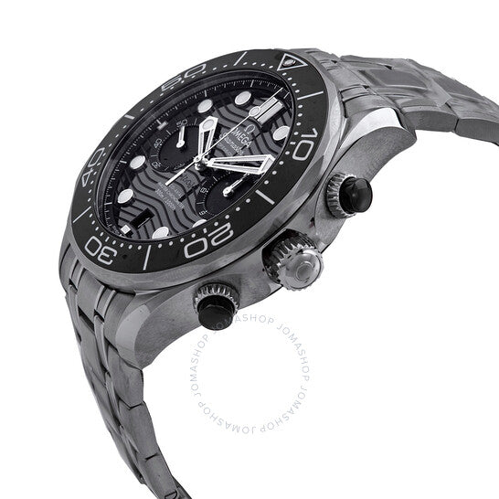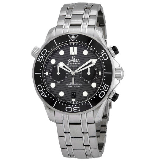 Stainless steel case with a stainless steel bracelet. Uni-directional rotating stainless steel bezel with a black ceramic (count-up elapsed time) top ring. Black dial with luminous silvery white skeleton sword-shaped hands and dots hour markers. Minute markers around the outer rim. Dial Type: Analog. Luminescent hands and markers. Date display at the 6 o'clock position. Chronograph - two sub-dials displaying: 60 second and 12 hour. Omega calibre 9900 automatic movement, based upon Omega 9300, containing 54 Jewels, bitting at 28800 vph, and has a power reserve of approximately 60 hours. Scratch resistant sapphire crystal. Screw down crown. Transparent case back. Round case shape. Case size: 44 mm. Band width: 21 mm. Fold over clasp with a push button release. Water resistant at 300 meters / 1000 feet. Functions: chronograph, date, hour, minute, second,chronometer. Seamaster Series. Dive watch style. Watch label: Swiss Made. Omega Seamaster Chronograph Automatic Chronometer Black Dial Watch 210.30.44.51.01.001.
