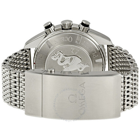 Stainless steel case with a stainless steel bracelet. Unidirectional rotating black ion-plated bezel. Black dial with luminous silver-tone hands and index hour markers. Arabic numerals mark the 3, 6, 9 and 12 o'clock positions. Minute markers around the outer rim. Luminescent hands and markers. Date display between the 4 and 5 o'clock positions. Chronograph - three sub-dials displaying: 60 seconds, 30 minutes and 12 hours. Self winding automatic movement. Scratch resistant sapphire crystal. Screw down crown. Solid case back. Case diameter: 45.5 mm. Case thickness: 17 mm. Deployment clasp. Water resistant at 600 meters / 2000 feet. Omega Seamaster Planet Chronograph Men's Watch 2210.52.