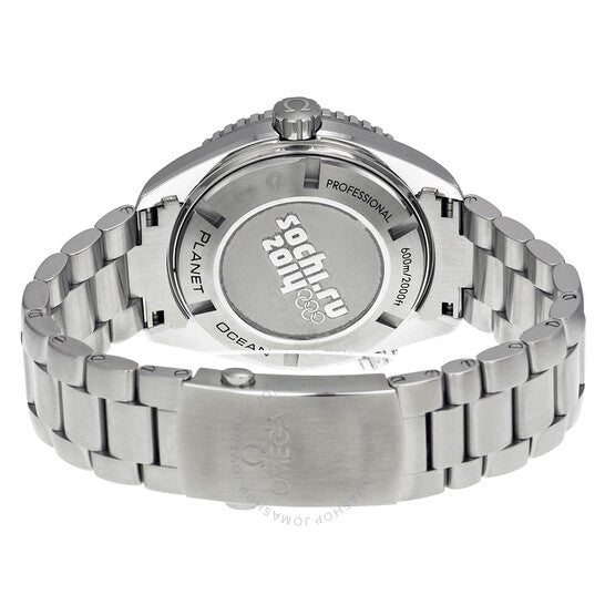 Stainless steel case with a stainless steel bracelet. Unidirectional black ceramic bezel. Black dial with luminous hands and index hour markers. Arabic numerals mark the 6, 9 and 12 o'clock positions. minute markers around the outer rim. Dial Type: Analog. Date display at the 3 o'clock position. Automatic movement. Omega caliber 8500, engine. Scratch resistant sapphire crystal. Screw down crown. Solid case back. Case diameter: 45.5 mm. Case thickness: 14.5 mm. Round case shape. Band width: 22.9 mm. Band length: 9 inches. Deployment clasp. Water resistant at 600 meters / 2000 feet. Functions: date, hour, minute, second. Additional Info: limited edition - only 2,014 pieces made - sochi 2014 watch. Luxury watch style. Watch label: Swiss Made. Item Variations: 522 30 46 21 01 001, 522-30-46-21-01-001, 522/30/46/21/01/001, 52230462101001. Omega Seamaster Planet Ocean OLYMPIC SOCHI 2014 Men's Watch 522.30.46.21.01.001.