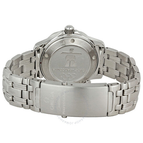 Silver-tone stainless steel case with a silver-tone stainless steel bracelet. Unidirectional red ion-plated bezel. White dial with luminous hands and dot hour markers. Minute markers around the outer rim. Dial Type: Analog. Luminescent hands and markers. Date display at the 3 o'clock position. Omega Calibre 2500 automatic movement with a 48-hour power reserve. Scratch resistant sapphire crystal. Screw down crown. Solid case back. Round case shape. Case size: 36.25 mm. Deployment clasp. Water resistant at 300 meters / 1000 feet. Functions: date, hour, minute, second, chronometer. Dive watch style. Watch label: Swiss Made. Omega Seamaster Vancouver 2010 Olympics Limited Edition Men's Watch 212.30.36.20.04.001.