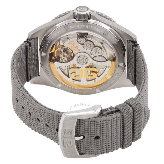 Silver-tone stainless steel case with a grey fabric strap. Uni-directional rotating green ceramic bezel. Green dial with silver-tone hands and index-Arabic numeral hour markers. Minute markers around the outer rim. Dial Type: Analog. Luminescent hands and markers. Date display at the 4 o'clock position. Glashutte Calibre 36-13 quartz movement with a 100-hour power reserve. Scratch resistant sapphire crystal. Screw down crown. Transparent see through case back. Round case shape, case size: 43.2 mm, case thickness: 15.65 mm. Tang clasp. Water resistant at 300 meters / 1000 feet. Functions: date, hour, minute, second. Seaq Series. Sport watch style. Watch label: Made in Germany. Glashutte SeaQ Quartz Green Dial Men's Watch 1-36-13-07-83-08.