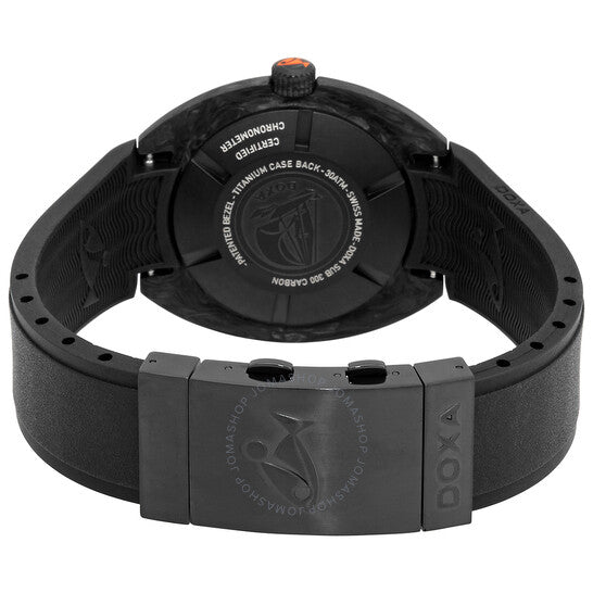 Black carbon case with a black rubber strap. Black bezel. Silver dial with black and red hands and index hour markers. Dial Type: Analog. Luminescent hands and markers. Date display at the 3 o'clock position. Automatic movement. Scratch resistant sapphire crystal. Screw down crown. Solid case back. Round case shape, case size: 42.5 mm. Buckle clasp. Water resistant at 300 meters / 1000 feet. Searambler Series. Dive watch style. Watch label: Swiss Made. Doxa Searambler Automatic Silver Dial Men's Watch 822.70.021.20.