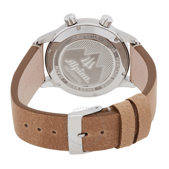 Stainless steel case with a brown (calfskin) leather strap. Fixed stainless steel bezel. Black dial with luminous yellow gold-tone hands and index hour markers. Minute markers around the outer rim. Dial Type: Analog. Luminescent hands. Caliber AL-520 automatic movement with a 38-hour power reserve. Scratch resistant sapphire crystal. Screw down crown. Solid case back. Round case shape. Case size: 42 mm. Case thickness: 12.3 mm. Band width: 20 mm. Tang clasp. Water resistant at 300 meters / 1000 feet. Functions: hour, minute, second. Seastrong Diver 3000 Series. Dive watch style. Watch label: Swiss Made. Alpina Seastrong Diver 3000 Automatic Black Dial Men's Watch AL-520BY4H6.