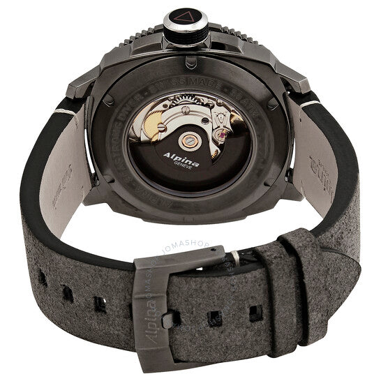Titanium PVD stainless steel case with a grey leather strap. Uni-directional rotating titanium PVD bezel with an inlaid grey ring. Grey dial with luminous black hands and index hour markers. Minute markers around the outer rim. Dial Type: Analog. Luminescent hands and markers. Date display at the 3 o'clock position. Alpina calibre AL-525 automatic movement, based upon Sellita SW200-1, containing 26 Jewels, bitting at 28800 vph, and has a power reserve of approximately 38 hours. Scratch resistant sapphire crystal. Screw down crown. Transparent case back. Round case shape. Case size: 44 mm. Case thickness: 13.6 mm. Band width: 22 mm. Tang clasp. Water resistant at 300 meters / 1000 feet. Functions: date, hour, minute, second. Seastrong Diver 300 Series. Dive watch style. Watch label: Swiss Made. Alpina Seastrong Diver 300 Automatic Grey Dial Meatch AL-525LGGW4TV6.
