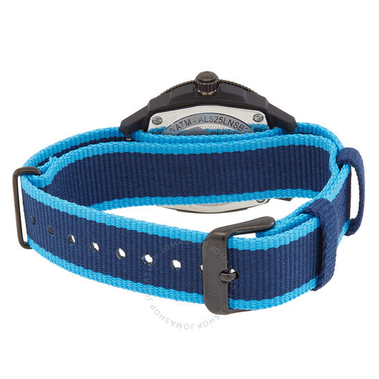 Recycled materials case with a two-tone blue NATO band. Uni-directional rotating black stainless steel-black PVD bezel. Blue dial with silver-tone hands and dots hour markers. Minute markers around the outer rim. Dial Type: Analog. Luminescent hands and markers. Date display at the 3 o'clock position. Alpina Calibre AL-525 Automatic movement, based upon Sellita SW200-1, containing 26 Jewels, bitting at 28800 vph, and has a power reserve of approximately 38 hours. Scratch resistant sapphire crystal. Screw down crown. Solid case back. Round case shape, case size: 36 mm. Buckle clasp. Water resistant at 300 meters / 1000 feet. Functions: date, hour, minute, second. Seastrong Diver Gyre Series. Watch label: Swiss Made. Alpina Seastrong Diver Gyre Automatic Blue Dial Ladies Watch AL-525LNSB3VG6.