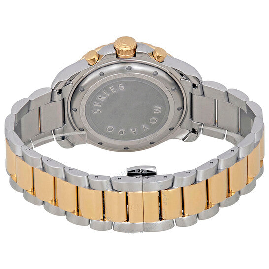 Yellow gold PVD stainless steel case with a two-tone (silver-tone and yellow gold PVD) stainless steel bracelet. Uni-directional rotating yellow gold PVD bezel with a black aluminum top ring. Black dial with luminous yellow gold-tone hands and index hour markers. Minute markers around the outer rim. The Movado dot appears at the 12 o'clock position. Dial Type: Analog. Luminescent hands and markers. Date display at the 4 o'clock position. Chronograph - three sub-dials displaying: 60 second, 30 minute and 12 hours. Quartz movement. Scratch resistant sapphire crystal. Screw down crown. Solid case back. Round case shape. Case size: 42 mm. Case thickness: 13 mm. Band width: 22 mm. Deployment clasp with a push button release. Water resistant at 200 meters / 660 feet. Functions: chronograph, date, hour, minute, second. Dress watch style. Watch label: Swiss Made. Movado Series 800 Chronograph Black Dial Men's Watch 2600146.