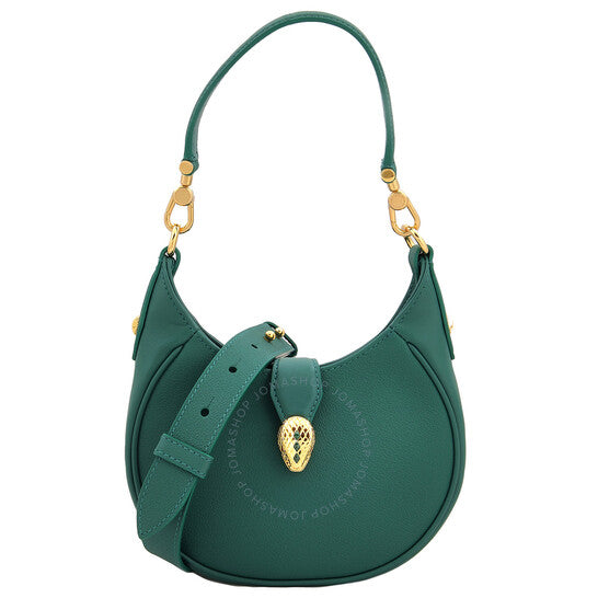 Bvlgari Ladies Hobo. SKU: 292582. Color: Green. Size: 19.5 x 20 x 4.5 cm. The Serpenti Ellipse small crossbody bag combines signature details and a unique shape, crafted from bright green urban grained calfskin, with a gem-encrusted magnetic snakehead closure inspired by a 1960s Bvlgari watch, featuring a chain and leather strap, leather handles, a top zipper, an internal pocket, an external back pocket, and a metal Bvlgari logo. 100% Calfskin. Made in Italy.