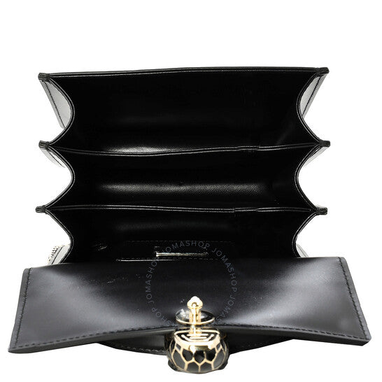 Bvlgari Ladies Top Handle Bag. SKU: 288915. Barcode: 8052749191633. Size: 18 cm x 15 cm x D 9.5 cm. Bvlgari Serpenti Forever Top Handle Bag. Crafted from luxurious smooth leather, this bag features the iconic Million Chain decor, adding a touch of sophistication. Its compartmentalized interior ensures organized storage, while the top handle and removable strap offer versatile styling options for shoulder or crossbody wear. 100% calf leather. Made in Italy.