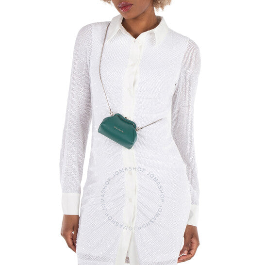 Bvlgari Ladies Shoulder Bag. SKU: 292594. Color: Green. Size: 4.7 x 3.1 x 2.4". Bvlgari Serpentine Calf Leather Micro Pouch. The serpentine micro pouch, crafted from emerald-green calf leather with a violet nappa leather interior, features a light gold-plated brass snake-shaped frame with engraved scales, red enamel eyes, and a chain strap. Material: Calf leather. Made in Italy.
