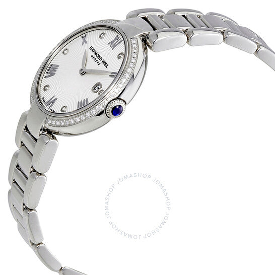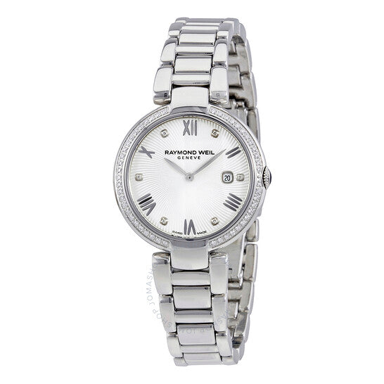 Stainless steel case with a stainless steel bracelet (interchangeable satin strap). Fixed stainless steel bezel set with diamonds. Silver dial with silver-tone hands and alternating Roman numeral and diamond hour markers. Dial Type: Analog. Date display at the 3 o'clock position. Quartz movement. Scratch resistant sapphire crystal. Solid case back. Round case shape. Case size: 32 mm. Case thickness: 8.63 mm. Bracelet width: 16 mm. Deployment clasp. Water resistant at 50 meters / 165 feet. Functions: date, hour, minute. Additional Info: Can be worn with the steel bracelet and satin strap interchangably. bezel features 49 diamonds. Luxury watch style. Watch label: Swiss Made. Raymond Weil Shine Silver Dial Diamond Ladies Watch 1600-STS-00618.