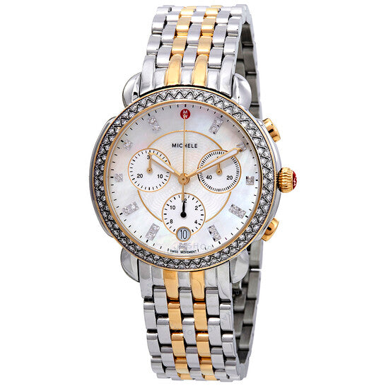 Stainless steel case with a two-tone (silver-tone and 18kt yellow gold-tone) stainless steel bracelet. Fixed 18kt yellow gold-tone bezel set with diamonds. Mother of pearl dial with luminous gold-tone hands and diamond-set index hour markers. Minute markers around the outer rim. Dial Type: Analog. Luminescent hands. Date display at the 6 o'clock position. Chronograph - three sub-dials displaying: 60 second, 30 minute and 12 hour. Quartz movement. Scratch resistant sapphire crystal. Solid case back. Round case shape. Case size: 38 mm. Case thickness: 11 mm. Band width: 18 mm. Fold over clasp with a push button release. Water resistant at 50 meters / 165 feet. Functions: chronograph, date, hour, minute, second. Sidney Series. Dress watch style. Watch label: Swiss Made. Michele Sidney Chronograph Mother of Pearl Dial Ladies Watch MWW30A000005.