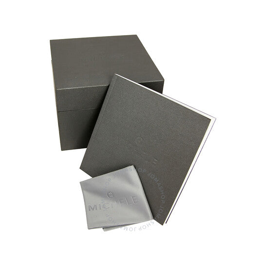 Stainless steel and rose gold-plated case with a two-tone (silver and rose gold-plated) stainless steel bracelet. Fixed rose gold-plated bezel. Mother of pearl dial with luminous rose gold-tone hands and diamond-set index hour markers. Minute markers around the outer rim. Dial Type: Analog. Luminescent hands. Date display at the 6 o'clock position. Chronograph - two sub-dials displaying: 60 second and 30 minute. Day of the week sub-dial at the 6 o'clock position. Quartz movement. Scratch resistant sapphire crystal. Solid case back. Case dimensions: 33 mm x 35 mm. Case thickness: 10.5 mm. Rectangle case shape. Band width: 18 mm. Band length: 6 inches. Deployment clasp. Water resistant at 50 meters / 165 feet. Functions: date, hour, minute, second. Dress watch style. Michele Signature Deco Diamond Mother of Pearl Two-tone Ladies Watch MWW06P000234.