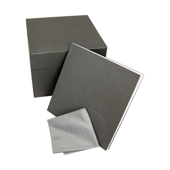 Champagne stainless steel case with a champagne leather strap. Fixed gold-tone stainless steel bezel. Champagne dial with luminous gold-tone hands and index hour markers. Diamond-set index markers at the 1, 4, 5, 7, 8 and 11 o'clok positions. minute markers around the outer rim. Dial Type: Analog. Luminescent hands. Date display at the 6 o'clock position. Chronograph - two sub-dials displaying: 60 second and 30 minute. day of the week display at the 12 o'clock position. Quartz movement. Scratch resistant sapphire crystal. Pull / push crown. Solid case back. Rectangle case shape, case size: 35 mm x 33 mm. Band width: 18 mm. Tang clasp. Water resistant at 50 meters / 165 feet. Functions: chronograph, date, hour, minute, second. E Signature Deco Series. Dress watch style. Watch label: Swiss Movement. Michele Signature Deco Ladies Watch MWW06P000198.