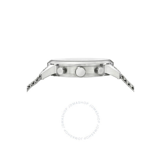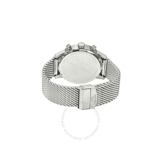 Silver-tone stainless steel case and bracelet. Fixed silver-tone stainless steel bezel. Black dial with silver-tone hands and index hour markers. Minute markers around the outer rim. Dial Type: Analog. Luminescent hands and markers. Quartz movement. Scratch resistant mineral crystal. Pull / push crown. Solid case back. Round case shape, case size: 44 mm. Band width: 22 mm. Fold over with double push button release clasp. Water resistant at 100 meters / 330 feet. Functions: chronograph, hour, minute, second. Simon Series. Luxury watch style. Watch label: Japan Movt. Porsamo Bleu Simon Chronograph Quartz Black Dial Men's Watch 1321BSIS.