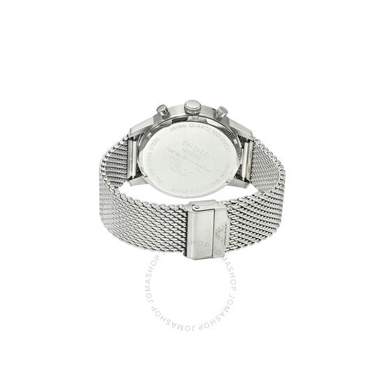 Porsamo Bleu Simon Chronograph Men's Watch; Stainless Steel Mesh Band; Silver and Blue Silver-tone stainless steel case and bracelet. Fixed silver-tone stainless steel bezel. Blue dial with silver-tone hands and index hour markers. Minute markers around the outer rim. Dial Type: Analog. Luminescent hands and markers. Quartz movement. Scratch resistant mineral crystal. Pull / push crown. Solid case back. Round case shape, case size: 44 mm. Band width: 22 mm. Fold over with double push button release clasp. Water resistant at 100 meters / 330 feet. Functions: chronograph, hour, minute, second. Simon Series. Luxury watch style. Watch label: Japan Movt. Porsamo Bleu Simon Chronograph Quartz Blue Dial Men's Watch 1321CSIS.